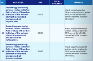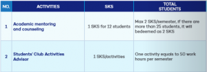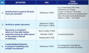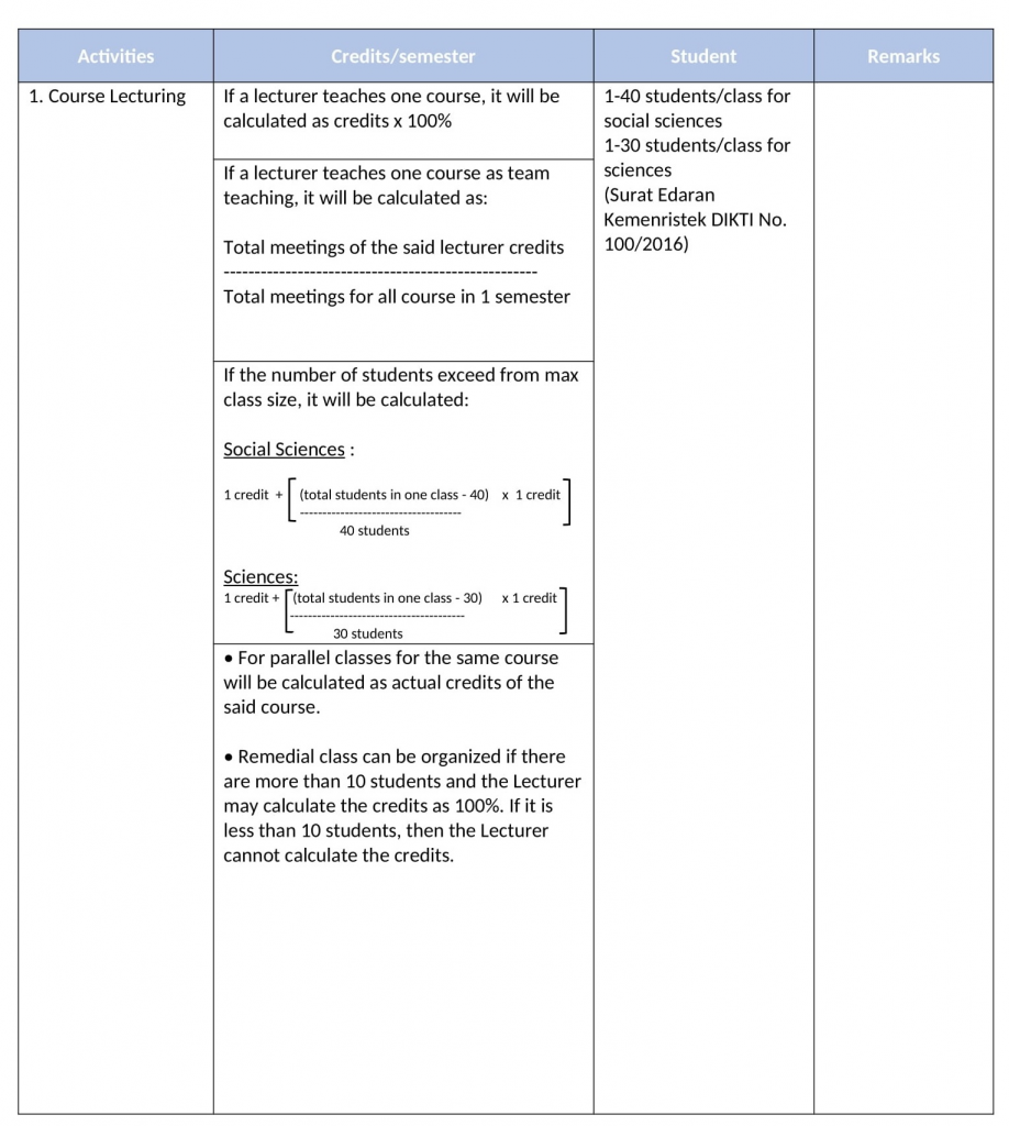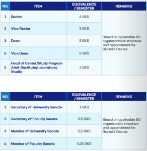 3. The workload for Lecturers of Sampoerna University for Full-time Teaching Equivalence (FTE/EWMP) is stipulated at the minimum of 30 (thirty) Satuan Kredit Semester (SKS) per year and maximum 36 (thirty-six) SKS per year. The required teaching load is 24 (twenty-four) Satuan Kredit Semester (credits) per year, provided that 1 SKS shall be deemed as 170 (one hundred seventy) minutes per week per semester, which is divided into (as per Permendikbud No. 3/202 article 19):